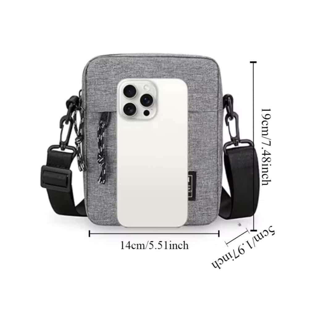 Medidas: 19 cm. alto x 14 cm. ancho x 5 cm. profundidad Colores: Negro, gris y azul Tela: Oxford
