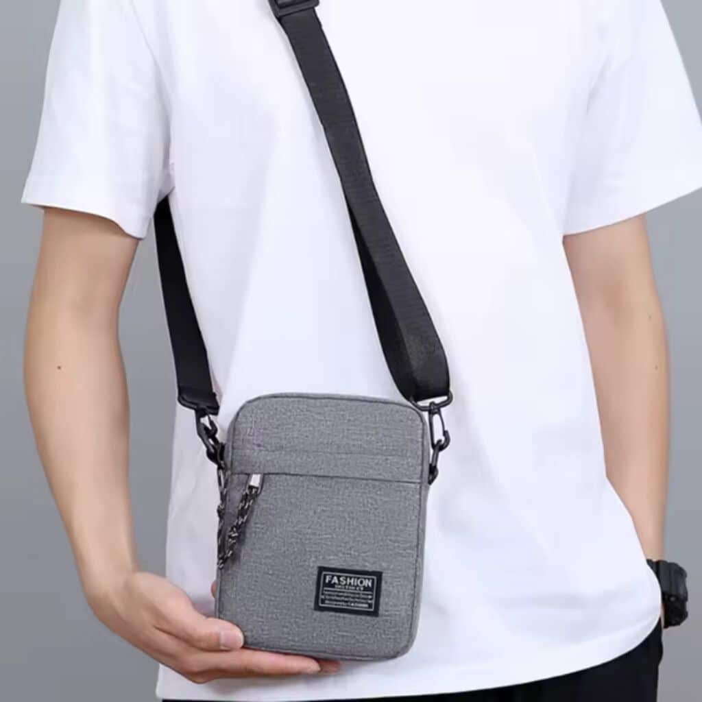 Medidas: 19 cm. alto x 14 cm. ancho x 5 cm. profundidad Colores: Negro, gris y azul Tela: Oxford