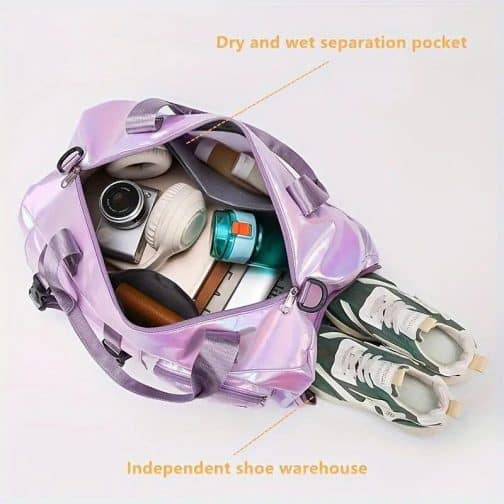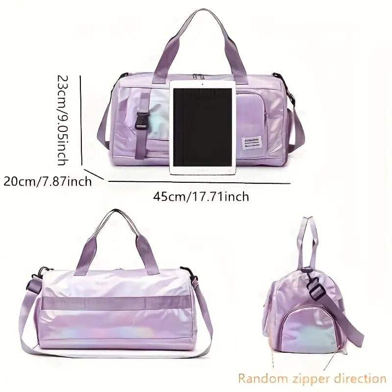 Bolso deportivo y de viaje con gran capacidad, ideal para escapadas de fin de semana, gimnasio o uso diario. Fabricado en nylon resistente, cuenta con un atractivo acabado iridiscente que combina estilo y funcionalidad.