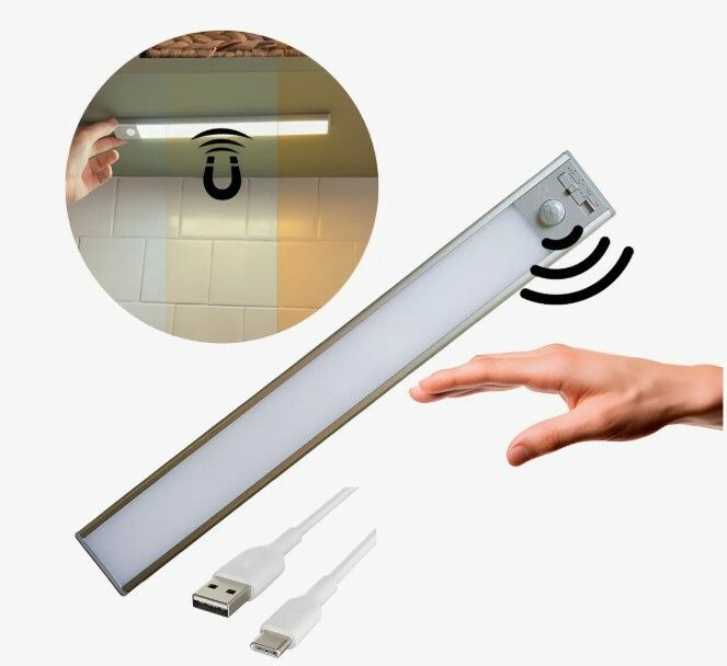 Lampara Led, con sensro de movimiento+USB, luz calida, blanca, neutra, disponible en plata y negro, 4 medidas, recargable, mando a distancia, base magnetica