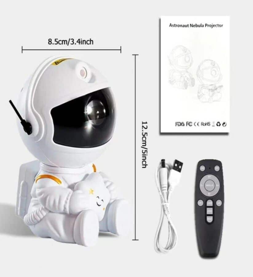 Lampara Astronauta, sujeta estrellas y/o sujeta guitarra, alimentacion por USB, Proyeccion de estrellas y nebulosa en 7 diferentes colores y alta definicion, mando a distancia con 2 pilas AA (No Incluidas), ajuste a 360º, Entrada 110-240v / Potencia 5v, longitud de cbale: 1 metro, material Plastico ABS y componentes electricos.