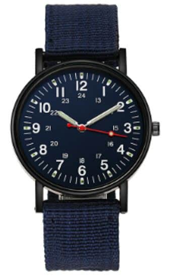 Reloj de pulsera Clasico de cuarzo, diametro del Dial 40mm, Iluminacion nocturna, Caja interna de plastico y acero inoxidable, pantalla de cristal, peso 40 grs. malla en tela+hebilla en acero inoxidable, Presentacion en bolsa individual, KIT dividido en packs x 50