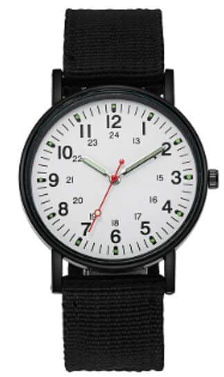 Reloj de pulsera Clasico de cuarzo, diametro del Dial 40mm, Iluminacion nocturna, Caja interna de plastico y acero inoxidable, pantalla de cristal, peso 40 grs. malla en tela+hebilla en acero inoxidable, Presentacion en bolsa individual, KIT dividido en packs x 54